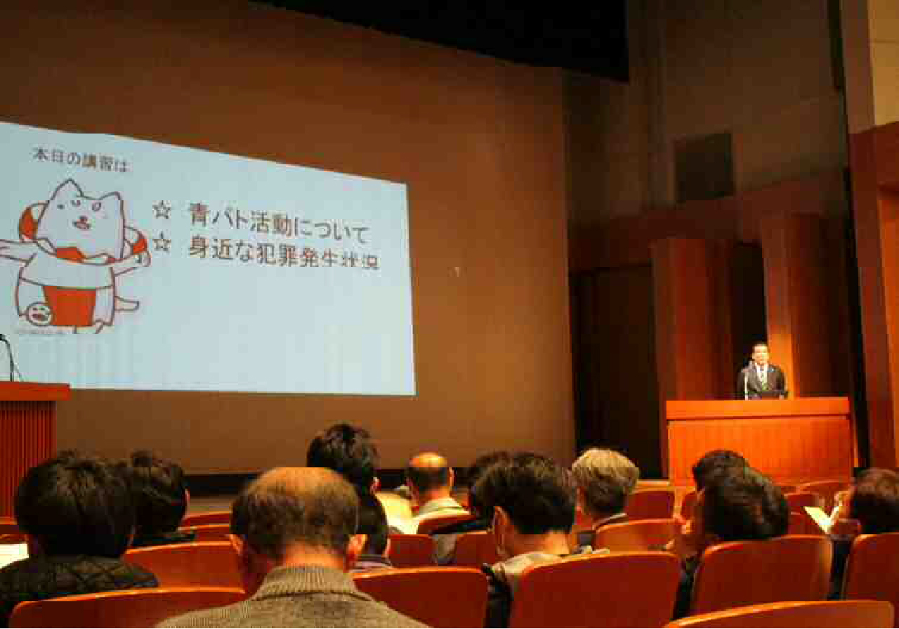 地域で防犯活動に携わる方、新たに防犯活動に従事する方を対象に、犯罪情勢、青色防犯パ トロール実施上の留意事項など青色防犯パトロールを行う上で必要と認められる事項を学ぶ。
