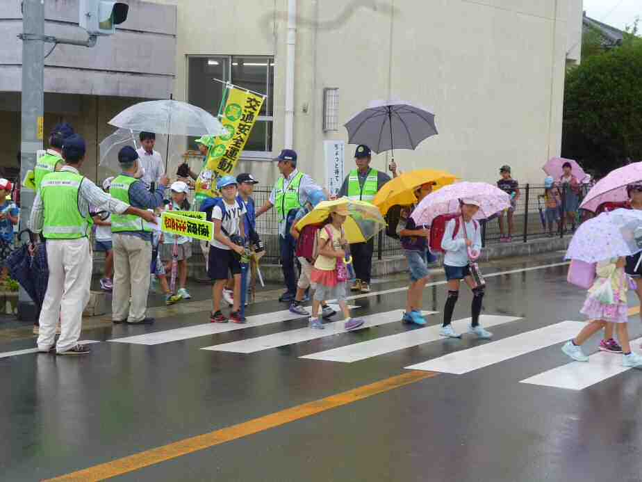 朝・夕方の登下校時間に合わせて地域ボランティアが横断歩道や信号機のない交差点等に 立ち、旗振りや声掛けにより通学路の安全確保に努めている。